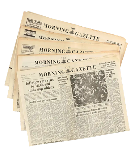 Welcome to the archive of the Morning Gazette Newspaper, which was founded in 1674 and ceased printing in 1951. Please use the search function below to look through our records. We have a full selection of articles on this online resource but if you should fail to find what you are looking for please feel free to visit our London archive in person, or write to us at our head office.